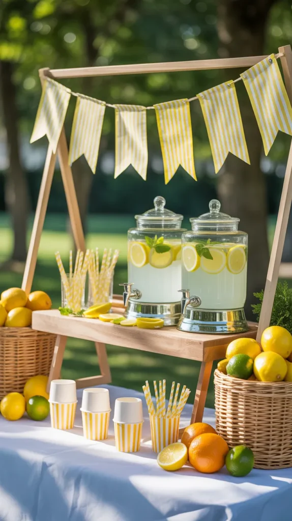 A lemonade stand theme is refreshing and perfect for summer. Set up a small drink station with glass jars of lemonade and citrus decorations. Use yellow and white decor for a bright, cheerful vibe.