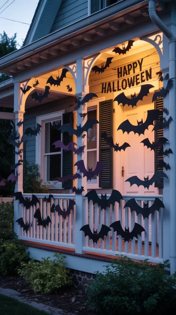 Attach cut-out bats to your porch walls, fences, or railing, flying upwards for a dynamic 3D effect. Use black and dark purple shades for depth and add small lights for shadow play. It creates a dramatic and cinematic Halloween vibe.