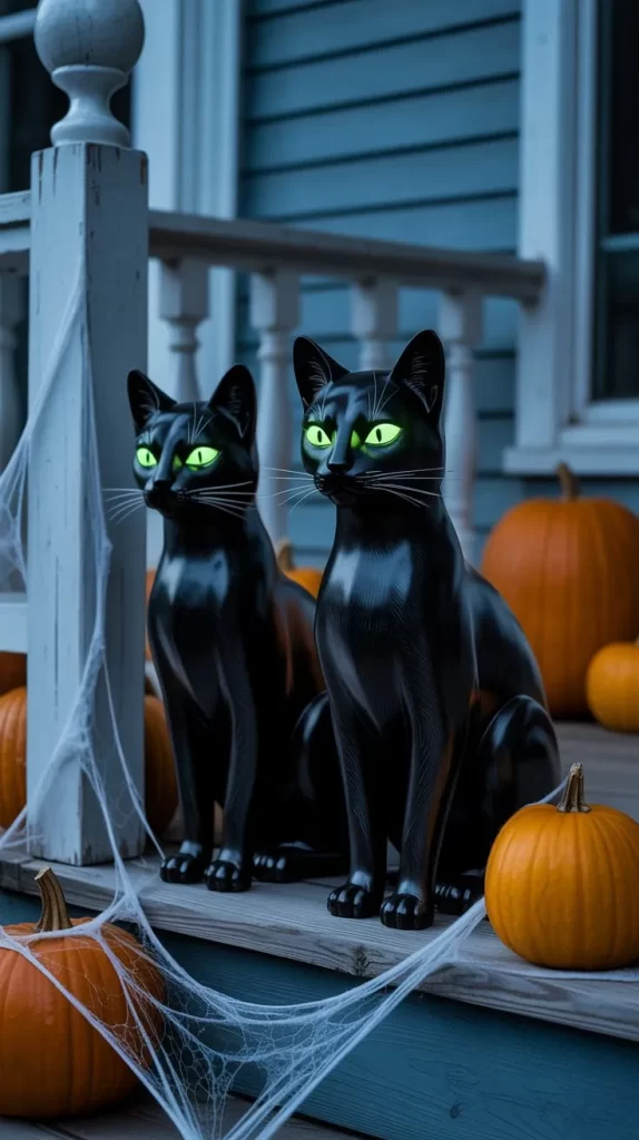 Place black cat cutouts or statues around your porch for classic Halloween charm. Add glowing eyes with small LED lights and a few pumpkins to complete the spooky scene. Cats are timeless symbols of Halloween and instantly create a mysterious atmosphere.