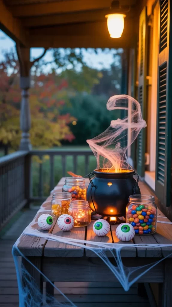 Set up a table or crate arrangement on your porch filled with Halloween candy jars, fake eyeballs, and cobwebs. Add a cauldron or bowl with a fake potion effect for a dramatic twist. It’s perfect for trick-or-treaters and doubles as an eye-catching decor piece.