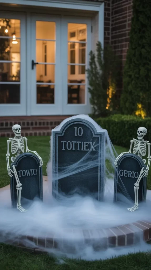 Create a mini graveyard on your patio using foam gravestones and dry ice or fog machine for mist. Add cobwebs and skeletons leaning against the tombstones for a haunted graveyard feel. Perfect for spooky nighttime ambiance and Instagram-worthy moments.