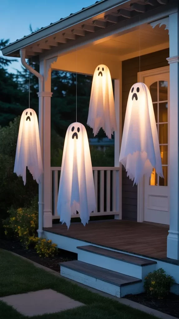 Use lightweight white fabric to create floating ghosts above your patio. Hang them at varying heights with invisible string to make them appear as if they’re floating in the wind. Add small battery-powered lights inside to give a gentle glow at night. This dynamic effect creates an eerie atmosphere that moves with the breeze, perfect for spooking both kids and adults.
