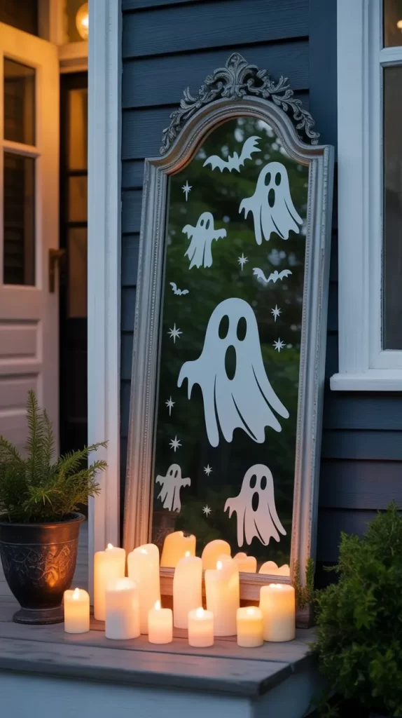 Place a tall vintage mirror on your patio and add ghostly decals or stickers. Position small LED candles in front of it for a mysterious reflection effect. You can also project subtle ghostly shadows for an immersive haunted experience. It’s a creative way to add intrigue and surprise to your porch setup.