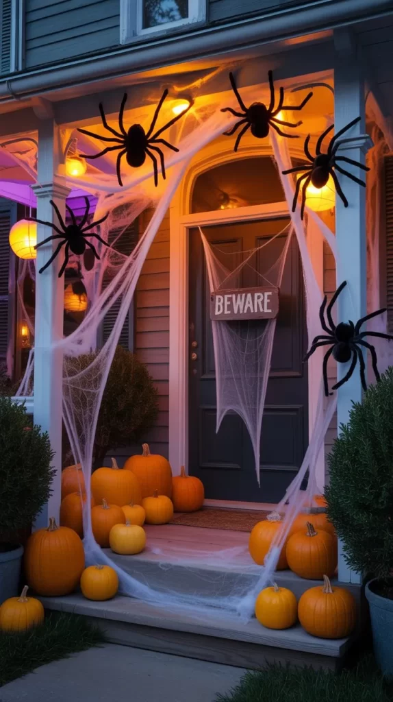 Cover your porch and patio corners with thick, stretchable spider webs. Add oversized spiders and some dangling from above to enhance the spookiness. Mix in small pumpkins and lanterns to balance the creepy with festive. This decor gives a haunted forest feeling right at your entrance.