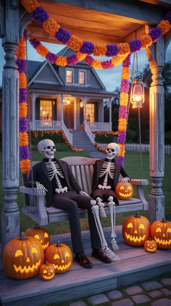 Decorate a porch swing or bench with Halloween garlands, pumpkins, and skeletons seated casually. Add a flickering lantern beside it for a cozy yet eerie setup. This idea invites interaction and adds a unique focal point to your porch decor.