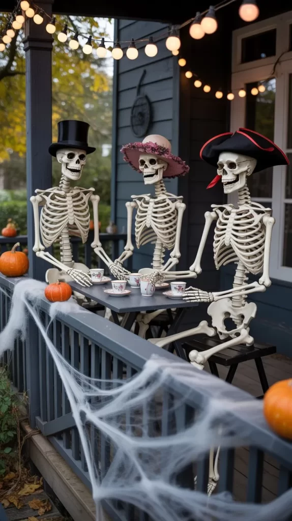 Arrange life-size skeletons seated or posed around your patio as if hosting a Halloween party. Give them tiny props like mini plates, cups, or hats for a playful twist. String fairy lights above to illuminate the scene at night, making it fun for kids while still spooky for adults.