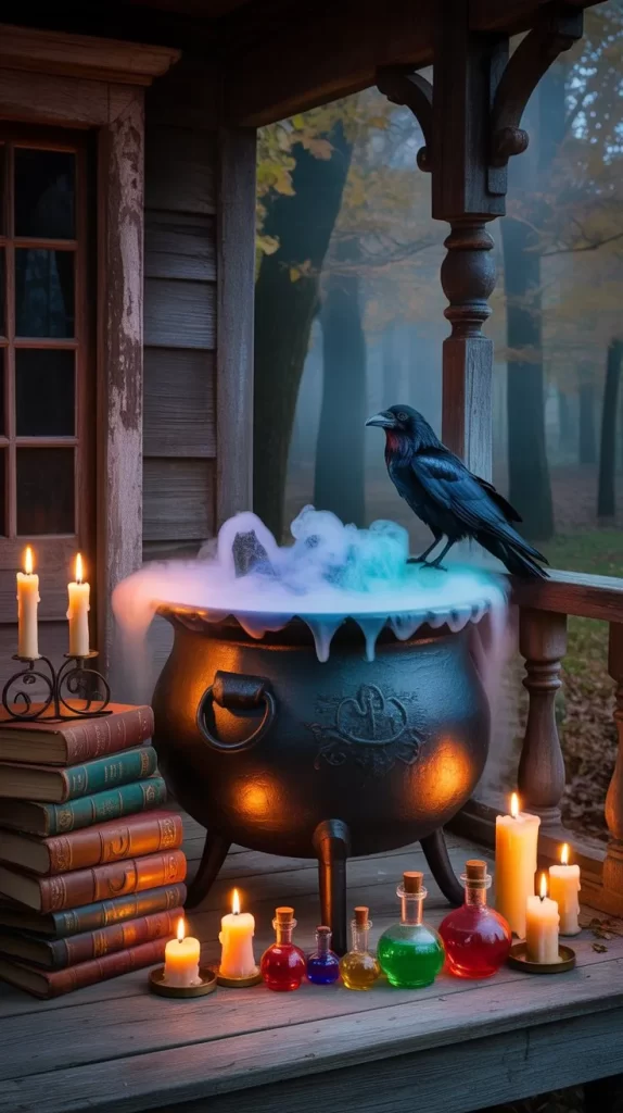 Place a witch’s cauldron in a corner of your patio with fake smoke rising from it. Use a dry ice effect or a small fog machine for a realistic bubbling potion vibe. Surround the cauldron with spellbooks, candles, and tiny potion bottles. This decoration gives a magical, haunted-house feel to your outdoor space and makes for great photo opportunities.