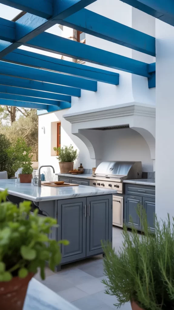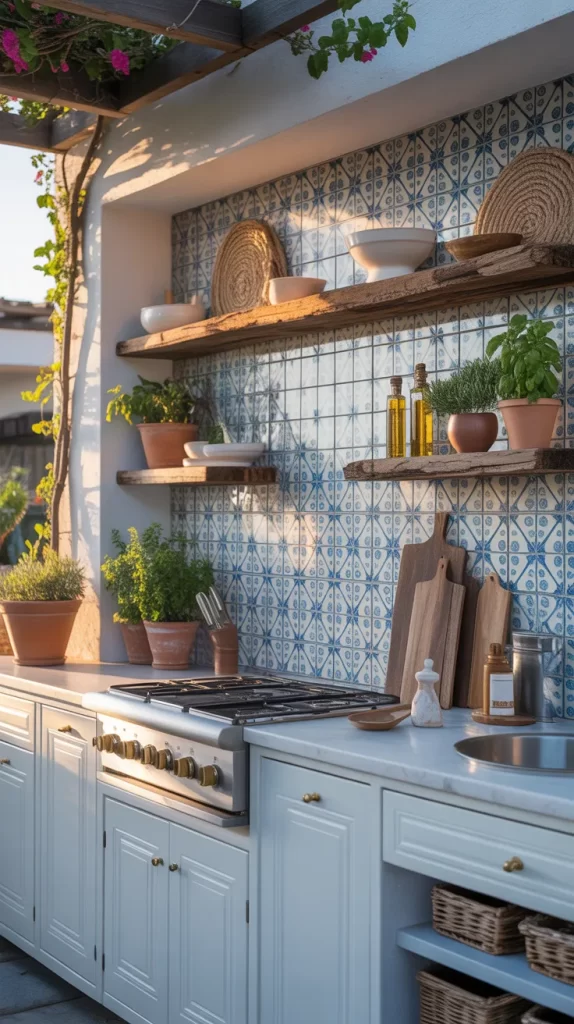 Give your outdoor kitchen a Mediterranean-inspired twist with blue and white patterned tiles. They add personality and charm while keeping the look fresh and breezy. Use them as a backsplash, on countertops, or even on the floor.