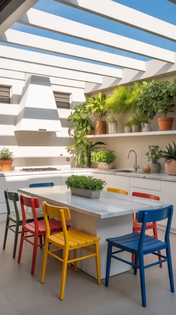 If you love creativity, try a mix of colorful furniture—chairs in red, blue, and yellow tones paired with a neutral backdrop. This instantly turns your kitchen into a fun, joyful space.