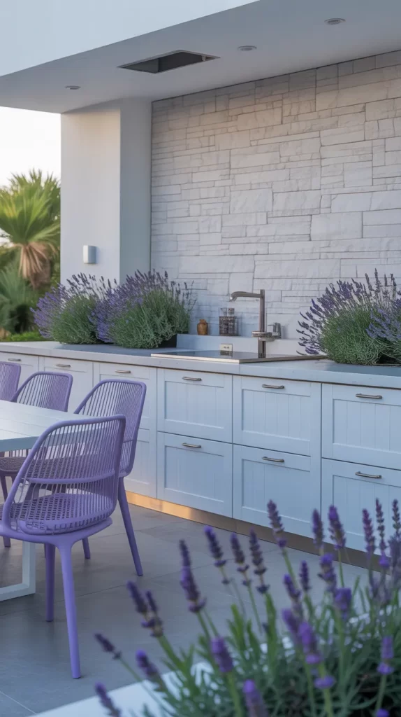 For a soothing touch, go for lavender tones in your seating or decor. This color pairs beautifully with light gray stone and white wood for a soft, modern finish.