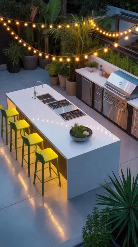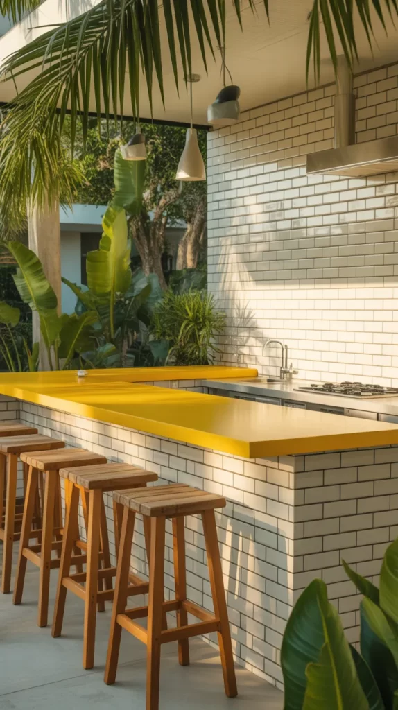 Bring sunshine to your outdoor kitchen with a bold yellow bar counter. This cheerful hue instantly adds warmth and positivity to your patio. Pair it with white or gray tiles for balance and a bright, open feel.