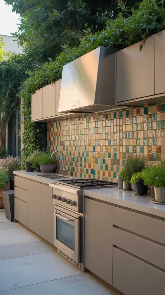 Combine with wooden accents and neutral cabinetry for a balanced, modern outdoor design that feels earthy yet fresh.