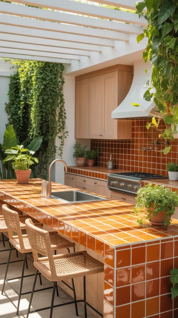 Brighten up your outdoor space with orange tile countertops. They create an energetic and happy atmosphere that’s perfect for outdoor parties and gatherings.