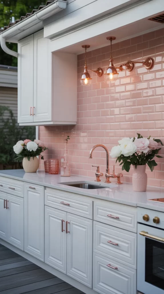 Add a soft, romantic charm with a blush pink backsplash. It instantly brightens your space and makes your outdoor kitchen feel elegant yet playful.