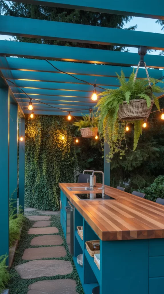 9. Teal Pergola with Wooden Counters