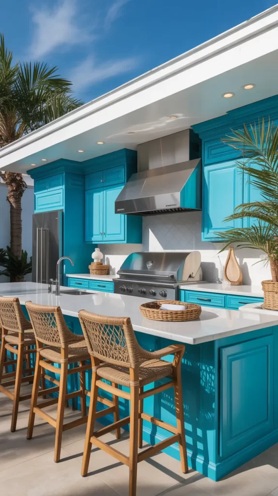 Transform your outdoor cooking space into a mini tropical retreat with turquoise cabinets. This vibrant shade pairs beautifully with white countertops and stainless steel appliances for a modern beach-inspired look.