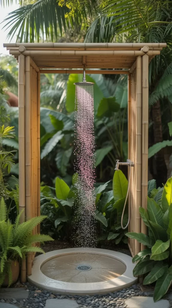 Bamboo adds a tropical, eco-friendly touch to any outdoor shower. A bamboo enclosure provides privacy while giving a light and airy feel. The natural textures and vertical lines complement wooden or stone flooring beautifully. Perfect for resort-style gardens, bamboo showers create a serene, calming environment that invites relaxation and rejuvenation.
