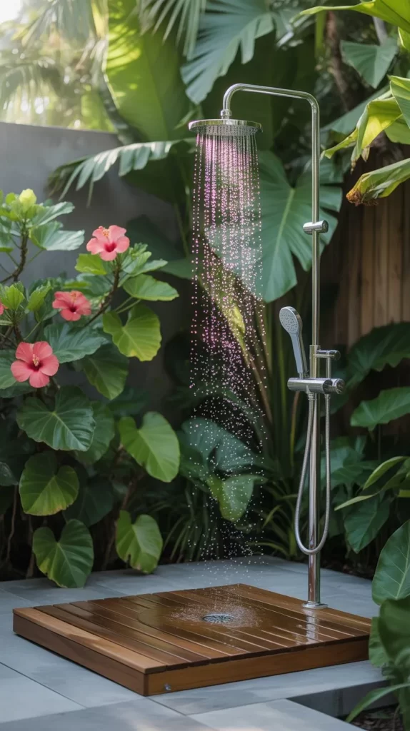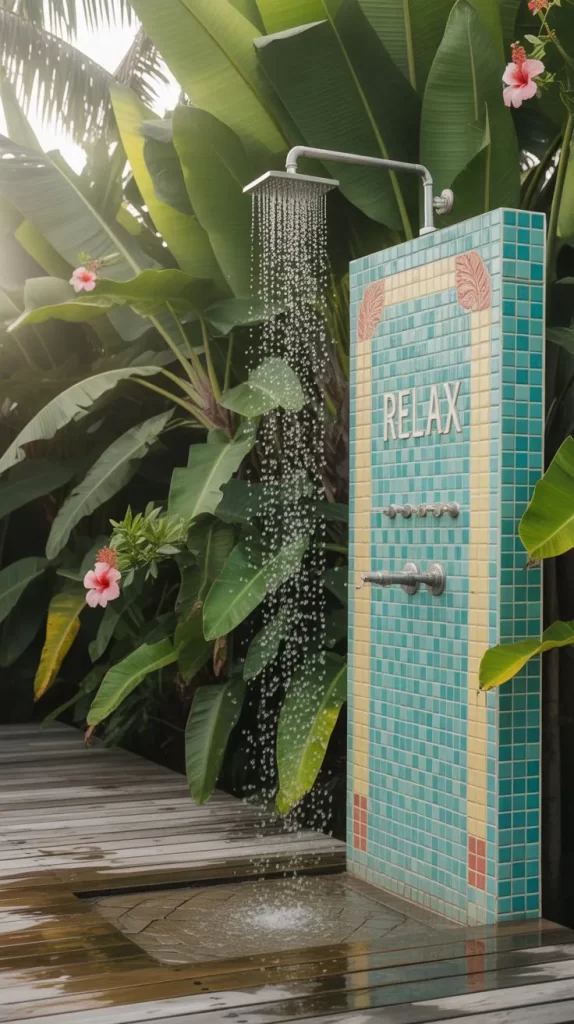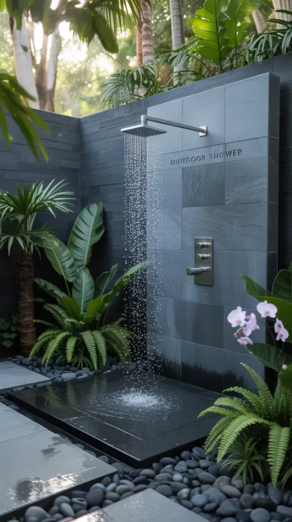 Incorporating large tropical leaves or plants enhances the natural, relaxing feel of your shower. Place palm fronds, ferns, or potted plants strategically to provide privacy and a resort-like vibe. Tropical foliage adds color, movement, and life to the outdoor shower space.