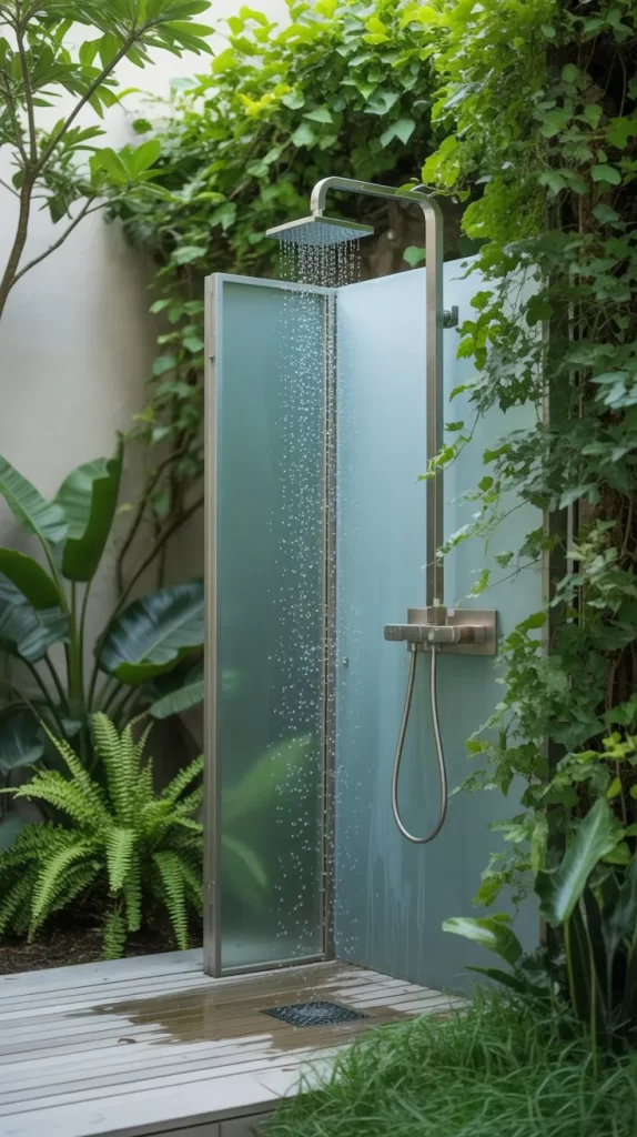 Glass panels offer a modern, sophisticated look while providing partial privacy. Clear or frosted glass maintains openness and integrates seamlessly with garden landscapes. Combine with stone or wooden flooring for a stylish and contemporary outdoor shower that feels both airy and luxurious.