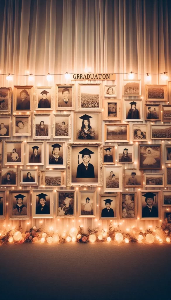 A photo wall is a meaningful and sentimental way to highlight the graduate’s journey and achievements. It’s not only a great decorative element but also a perfect way for guests to reminisce and take photos.