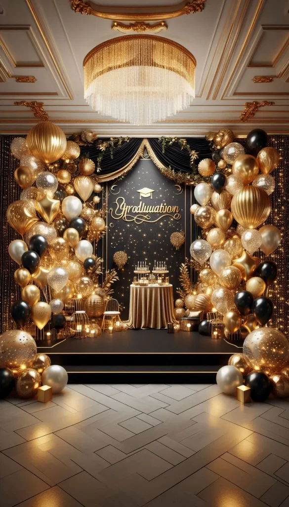 Metallic decor adds a touch of luxury and elegance to any graduation backdrop. Gold, silver, or rose gold accents can make your party feel high-end and celebratory.