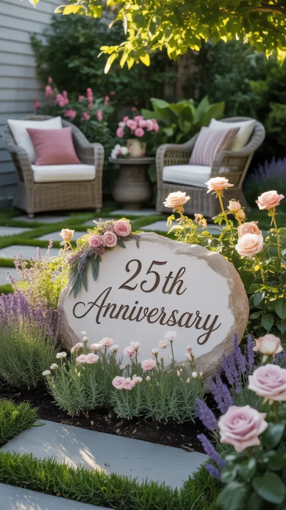 Anniversary milestone ceramic stones celebrate 10, 25, or 50 years together. These stones can be placed near seating areas or flower beds as a lasting reminder.