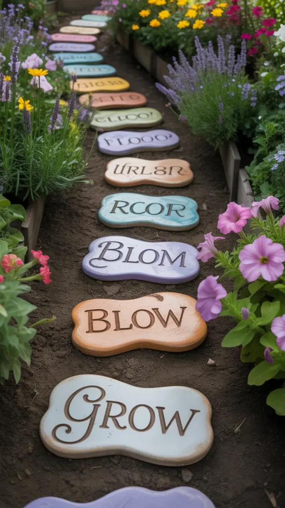Simple words like “Bloom,” “Grow,” or “Dream” are trendy choices for personalized ceramic garden stones. These small stones are easy to place between plants or along pathways.