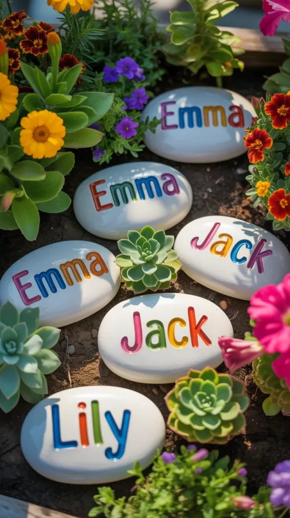 Personalized ceramic garden stones with children’s names are perfect for family gardens. You can place them near small plants or create a “kids’ garden” section. Bright colors and playful fonts make them extra special.
