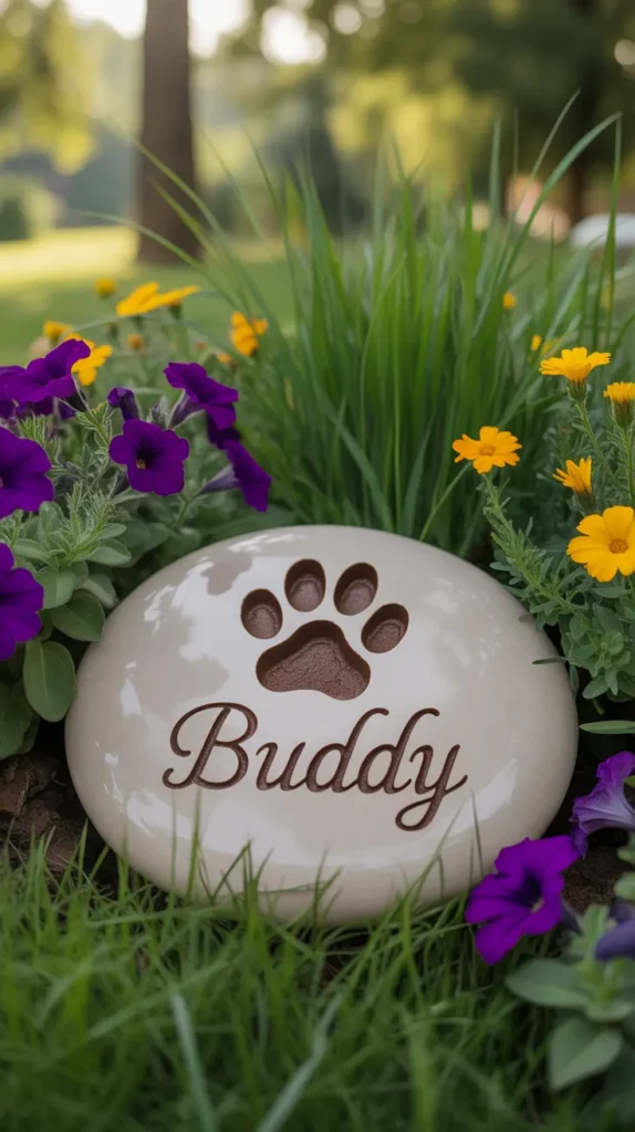 Pet lovers often choose personalized ceramic garden stones with paw prints and pet names. These stones can mark a favorite resting spot or simply celebrate a beloved animal.