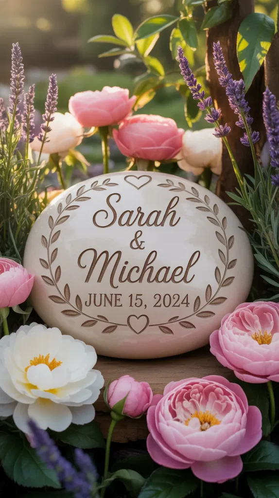Wedding date ceramic garden stones are a romantic addition to flower beds or backyard seating areas. You can customize them with names and anniversary dates for a personal touch.