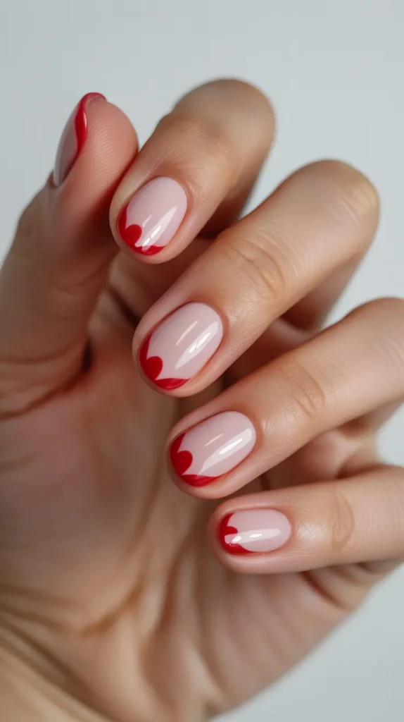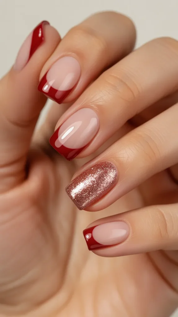 Red French tips are a bold upgrade from the traditional white tip, and they look stunning for Valentine’s season. Start with a sheer nude or light pink base, then paint crisp red tips across each nail. Add one accent nail in pink glitter to create a fun highlight without making the whole set look too busy. This is a great investment look because it feels salon-inspired but is easy to do at home.