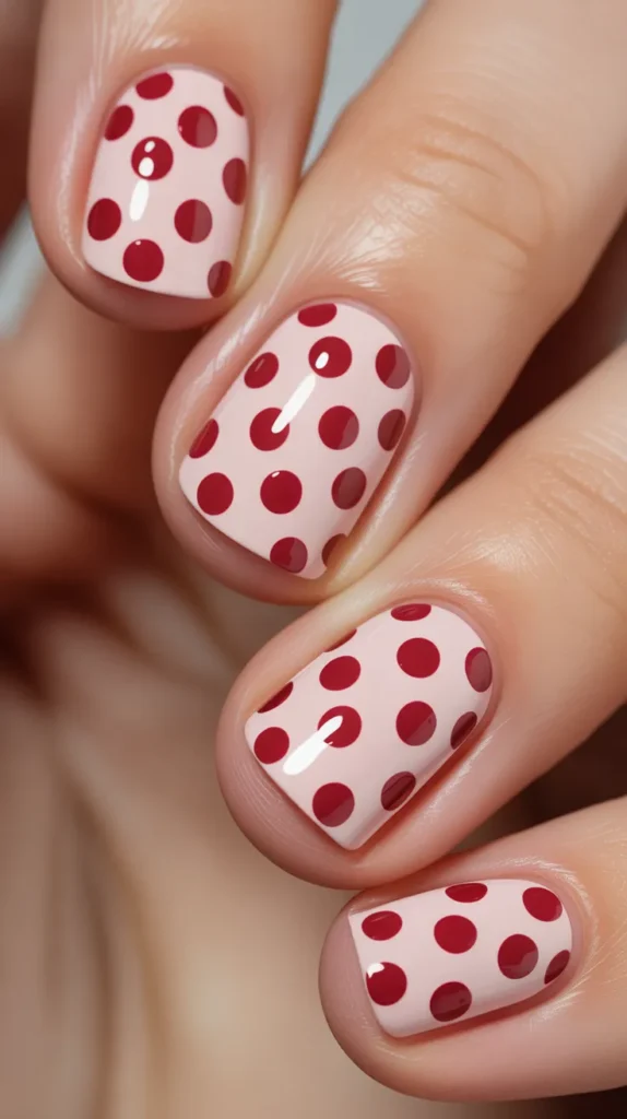 Polka dot nails are simple, cute, and beginner-friendly. Paint your nails a soft pink, then add red dots in neat rows or a scattered pattern. This retro style feels fun and youthful, and it works well on both short and long nails. If you want an easy look that still fits the holiday theme, this is one of the most budget-friendly designs you can do.