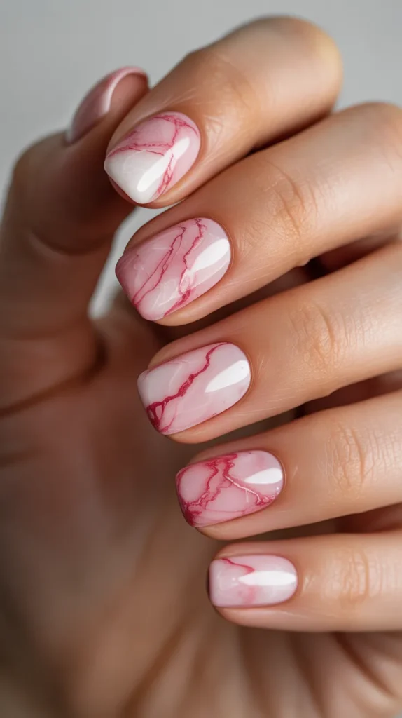 Marble nails look fancy and expensive, but you can create a simple version at home. Start with a light pink base, then add soft white swirls and thin red lines to mimic marble veins. This style feels elegant and romantic, making it a strong pink and red Valentines Day nail art inspiration option for a dressy event.