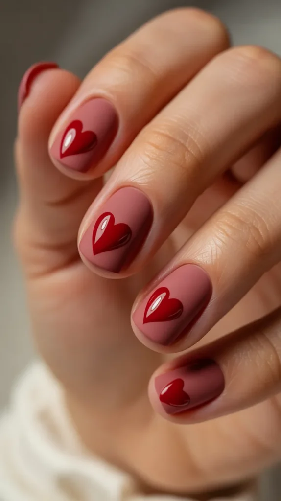 Mixing matte and glossy finishes creates a rich, expensive-looking effect without extra cost. Paint your nails pink, then apply a matte top coat. After it dries, add glossy red hearts on top using a small brush or dotting tool. The shine of the hearts against the matte background looks detailed and stylish, making it great for pink and red Valentines Day nail art inspiration content.