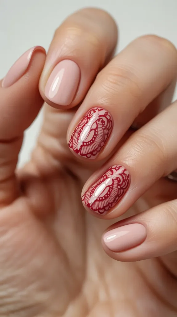 A red lace pattern over pink nails gives a romantic, vintage feel. Start with a soft pink base, then create lace-like details using thin red lines, tiny curves, and small dots. You can do lace on just one accent nail if you want a simpler look. This style feels delicate and special, perfect for Valentine’s Day photos.