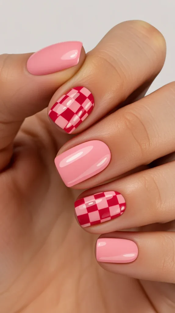 - 9) Pink and Red Checkerboard Accent Nails