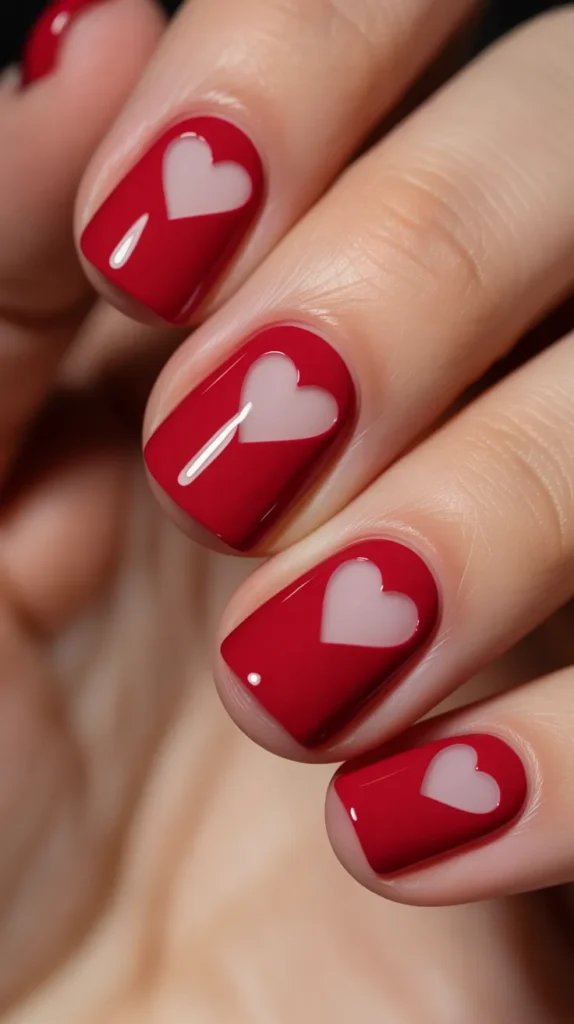 Negative space nail art looks modern and clean, and it’s a smart way to create contrast without extra clutter. Start with a red polish base, then leave small heart shapes unpainted so your natural nail shows through. You can create the heart shape using tape or a small sticker as a guide. This design feels bold, stylish, and very “Valentine’s Day” without needing glitter or gems.