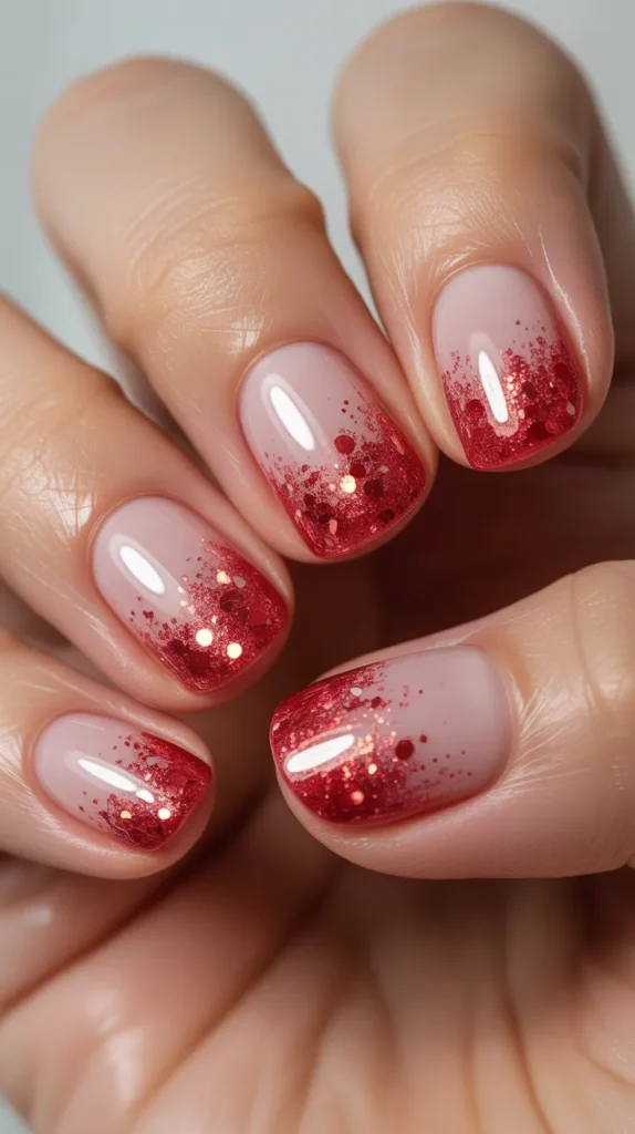 A glitter fade looks glamorous but is still easy for beginners. Start with a light pink base, then dab red glitter near the tips and blend it downward for a soft fade. This design gives you sparkle without needing rhinestones, and it looks amazing under indoor lights. It’s a great choice if you want nails that feel festive but still classy.