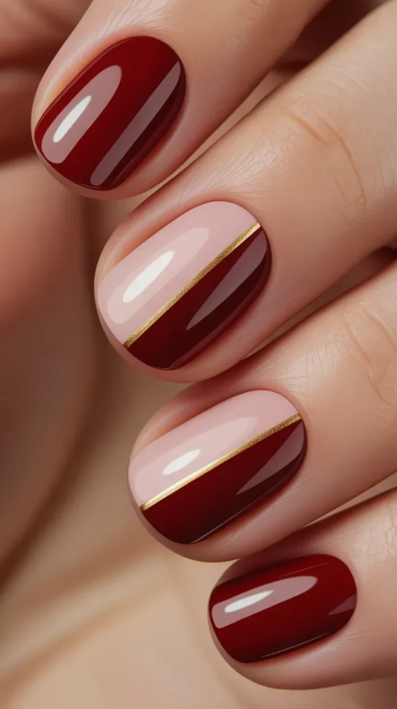 Half-and-half nails are bold, modern, and easy to customize. Split each nail into two halves—one red and one pink—either vertically or diagonally. Then add a thin gold line where the colors meet for a clean, polished look. This design feels like a high-end manicure, but it can still be budget-friendly when done at home.
