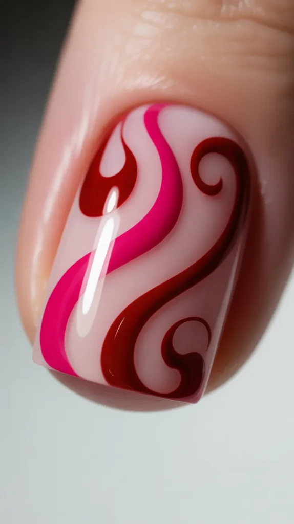 Swirl nails are one of the most popular trends for Valentine’s Day, and they look like candy ribbons. Use a light pink base, then add curved red and hot pink lines that swirl across each nail. The design looks playful but still stylish, making it perfect for anyone who wants something modern. This is strong pink and red Valentines Day nail art inspiration for Pinterest because swirls photograph well.