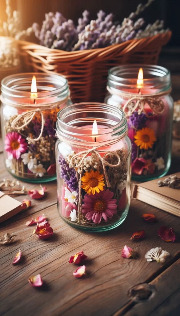Make decorative candles using real or faux flower petals inside simple glass jars.