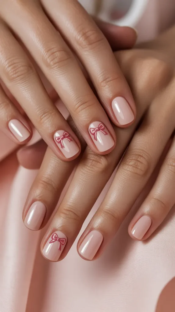 This design is perfect for short nails because small bows do not overwhelm the nail space. Finish with a clear top coat so the bows look smooth and sealed in. It’s a cost-effective way to get a cute, trendy manicure that looks like a special occasion design without spending a lot.