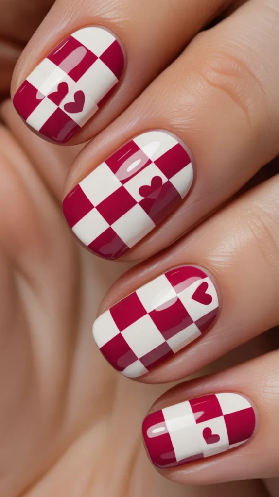 Checkerboard nails look trendy, and raspberry makes them feel more romantic. Use a white base on some nails and a raspberry base on others. Add checkerboard stickers to create the pattern, then place a small heart sticker on one accent nail to tie it into Valentine’s Day.