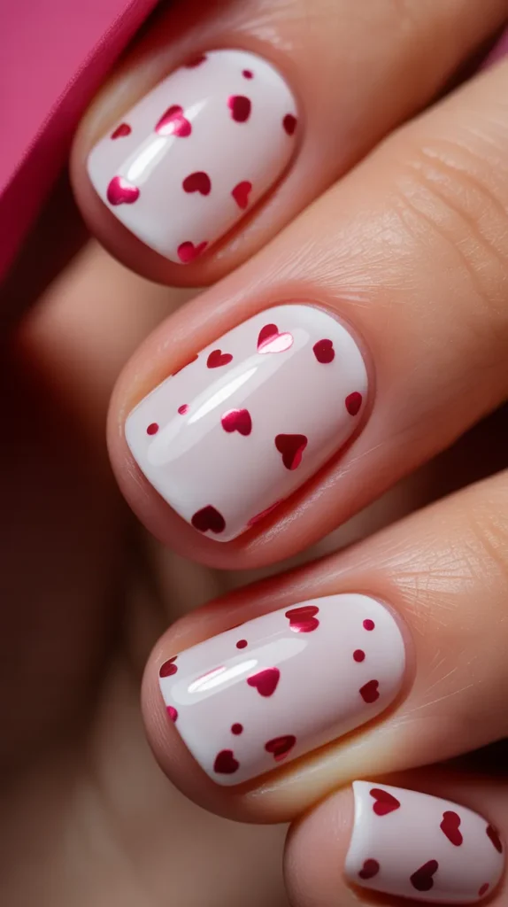 Raspberry confetti nail stickers are great if you love a cheerful manicure. Use a white or pale pink base, then add tiny raspberry hearts, dots, and sparkles across each nail. This gives a confetti effect that looks festive and perfect for Valentine’s Day.