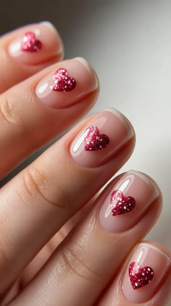 If you want something cute but simple, try raspberry glitter heart stickers on a clear or sheer base. The clear look feels light and natural, while the glitter hearts add the perfect Valentine sparkle. Place a few hearts on each nail so it looks balanced and not too crowded.
