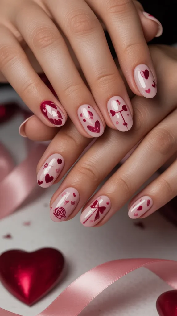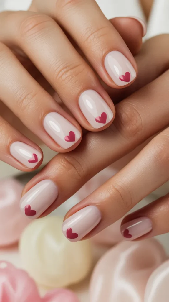 A milky nude base makes raspberry heart nail stickers look clean and classy. Start with a soft nude polish that matches your skin tone, then place raspberry heart stickers near the tips or along one side of each nail. This design feels romantic but not too loud, which makes it great for everyday wear during Valentine week.