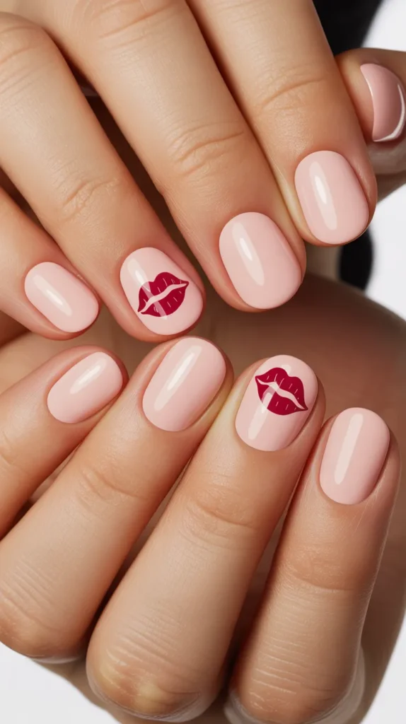 If you want something playful, raspberry lip stickers are a cute Valentine choice. Paint your nails a soft pink or blush base, then add lip stickers on a few accent nails. Keep the rest of the nails plain so the lips stand out without making the look feel too busy.