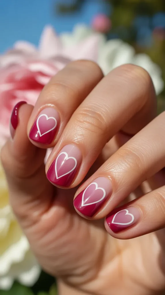Raspberry ombre nails look fancy, but you can keep it easy with stickers. Blend a soft pink into raspberry shade from base to tip. Once dry, place heart outline stickers in white or metallic gold on top. The outline style keeps the ombre visible while adding a clear Valentine theme.