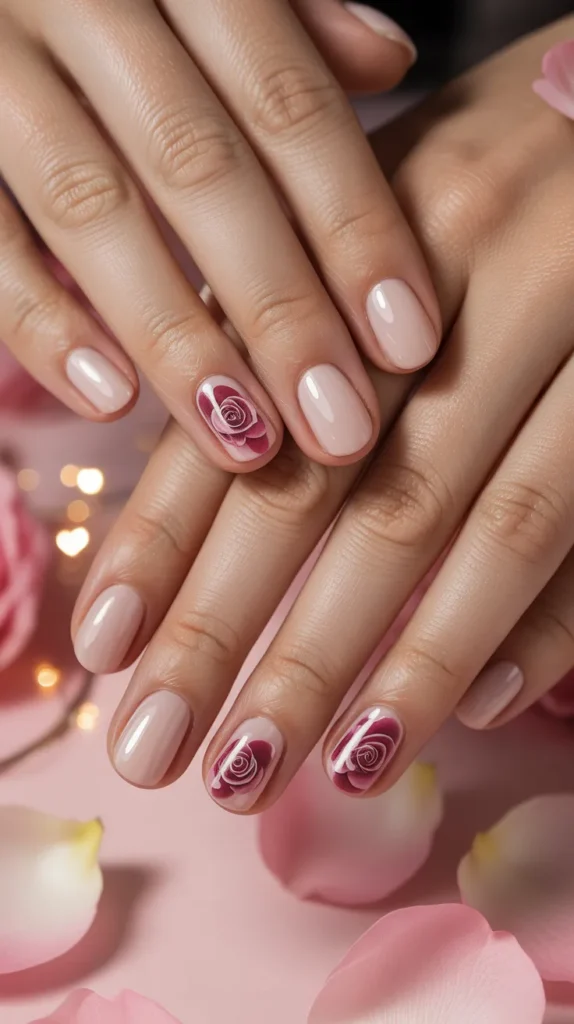 Raspberry rose nail stickers are perfect if you love floral Valentine nail art. Start with a pale pink, nude, or milky white base. Add one rose sticker on each ring finger nail, or place roses on two nails per hand for a more decorated look. Raspberry roses feel richer than classic red, so they look trendy and soft at the same time.