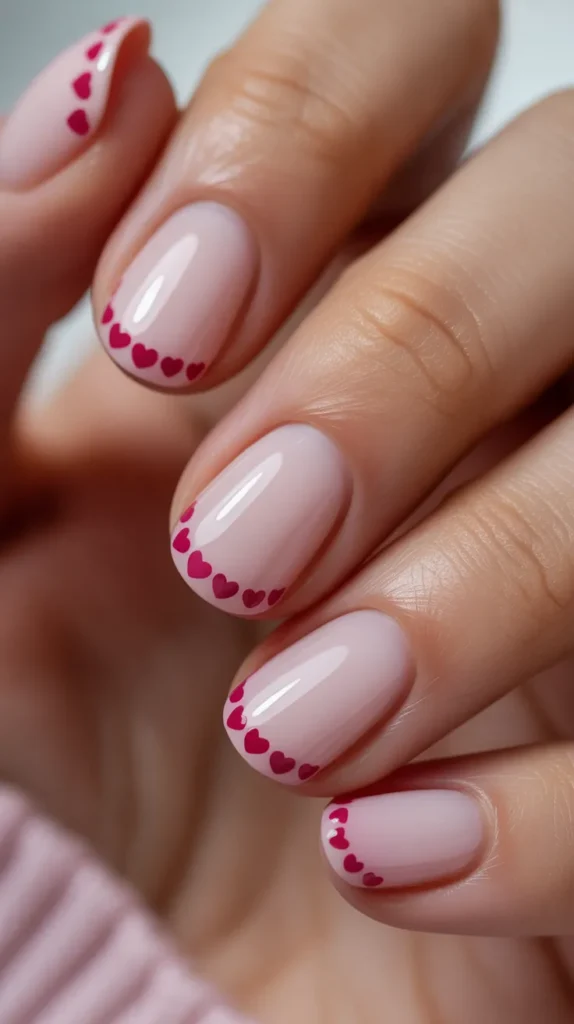To make it last longer, press each sticker down gently with a fingertip or a silicone tool and seal it with a glossy top coat. This look is a cost-effective way to get a salon-style manicure at home. It’s also a smart purchase because nude polish and heart stickers can be reused for many other cute nail designs later.